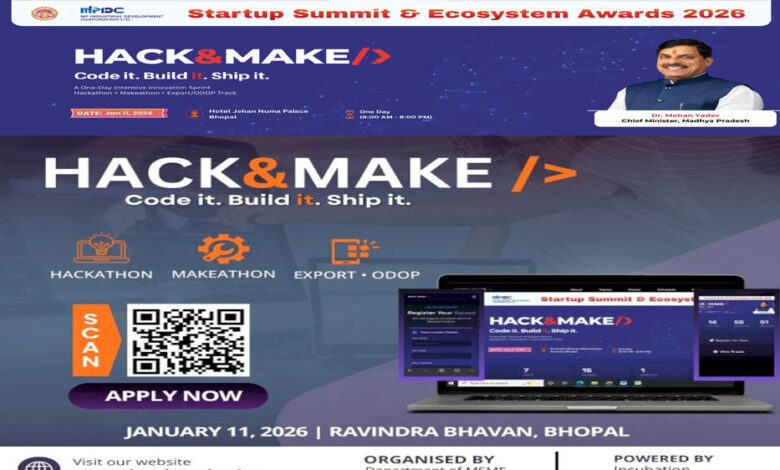 भोपाल में ‘हैक & मेक’ 2026 का आयोजन भोपाल के जहांनुमा पैलेस होटल में 11-12 जनवरी को किया जायेगा। भारत की पहली राज्य-स्तरीय ट्राई-ट्रैक नवाचार का यह अभिनव आयोजन सॉफ्टवेयर विकास, हार्डवेयर प्रोटोटाइपिंग और निर्यात–व्यापार समाधान के क्षेत्रों में एक साथ क्रियान्वयन-आधारित नवाचार को बढ़ावा देगा। मध्यप्रदेश शासन की यह पहल पारंपरिक हैकथॉन से आगे बढ़ते हुए प्रतिभागियों के समक्ष कार्यान्वयन-केन्द्रित मॉडल बनाने की चुनौती प्रस्तुत करती है। प्रतियोगिता में चयनित सॉल्युशंस को वास्तविक धरातल पर लागू करने के लिये अवसर उपलब्ध कराए जायेंगे।