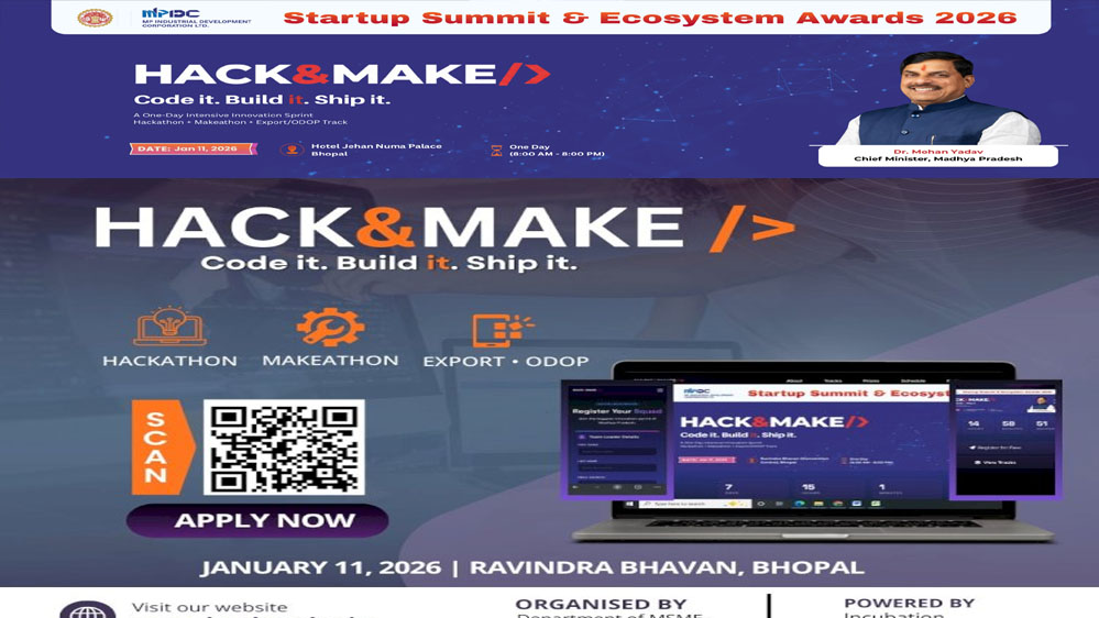 भोपाल में ‘हैक & मेक’ 2026 का आयोजन भोपाल के जहांनुमा पैलेस होटल में 11-12 जनवरी को किया जायेगा। भारत की पहली राज्य-स्तरीय ट्राई-ट्रैक नवाचार का यह अभिनव आयोजन सॉफ्टवेयर विकास, हार्डवेयर प्रोटोटाइपिंग और निर्यात–व्यापार समाधान के क्षेत्रों में एक साथ क्रियान्वयन-आधारित नवाचार को बढ़ावा देगा। मध्यप्रदेश शासन की यह पहल पारंपरिक हैकथॉन से आगे बढ़ते हुए प्रतिभागियों के समक्ष कार्यान्वयन-केन्द्रित मॉडल बनाने की चुनौती प्रस्तुत करती है। प्रतियोगिता में चयनित सॉल्युशंस को वास्तविक धरातल पर लागू करने के लिये अवसर उपलब्ध कराए जायेंगे।