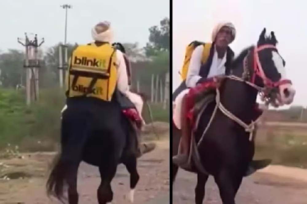 ‘रॉयल डिलीवरी’ का नया वीडियो, Blinkit वाले अंकल घोड़े पर सवार होकर पहुंचाते दिखे ऑर्डर