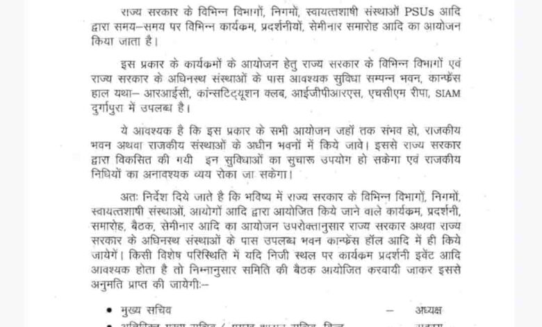 सरकार का कहना है कि इस फैसले से सरकारी सुविधाओं का सही इस्तेमाल होगा, और फालतू खर्च भी रुकेगा. इसको लेकर मुख्य सचिव वी. श्रीनिवास ने सभी विभागों, निगमों और स्वायत्तशासी संस्थाओं को निर्देश जारी कर दिए हैं, अब उन्हें कहा गया है कि अपने कार्यक्रम सरकारी भवनों और कॉन्फ्रेंस हॉल में ही करें.