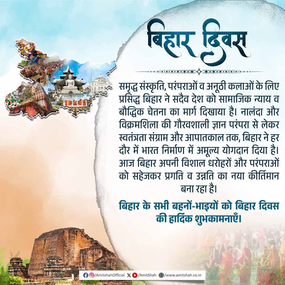 बिहार में आगामी सत्ता परिवर्तन समीकरणों को देखते हुए इस तरह के संदेशों के जरिए भाजपा लोगों के बीच भावनात्मक और वैचारिक जुड़ाव मजबूत करना चाहती है। विकास, विरासत और सामाजिक समरसता को एक साथ रखकर पार्टी अपने एजेंडे को व्यापक बनाने में जुटी है। संदेश के अंत में गृह मंत्री ने बिहार के लोगों को शुभकामनाएं देते हुए राज्य के उज्ज्वल भविष्य की कामना की। इंटरनेट मीडिया पर इस पोस्ट को व्यापक प्रतिक्रिया मिल रही है, जो यह दर्शाता है कि बिहार दिवस जैसे अवसर अब राजनीतिक संवाद का भी महत्वपूर्ण मंच बनते जा रहे हैं।