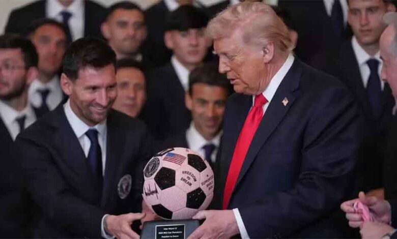 दिग्गज फुटबॉलर लियोनेल मेस्सी ने पिछले साल मेजर लीग सॉकर (एमएलएस) कप जीतने पर इंटर मियामी को सम्मानित करने के लिए व्हाइट हाउस में आयोजित एक समारोह के दौरान अमेरिका के राष्ट्रपति डोनाल्ड ट्रंप को रत्नजड़ित गुलाबी फुटबॉल भेंट की।