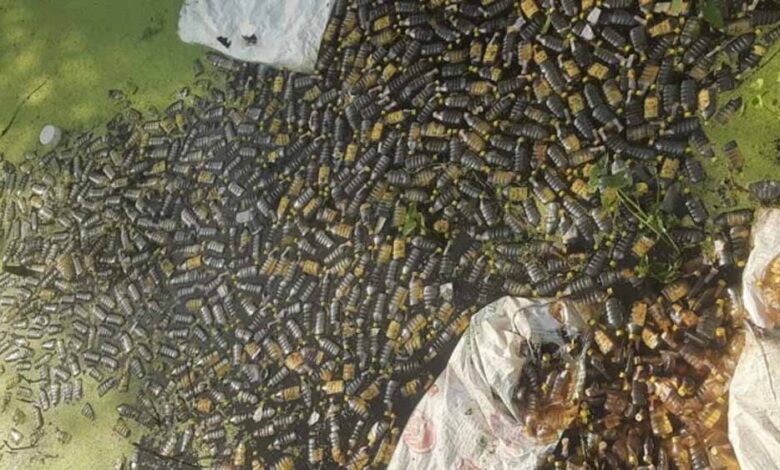 रविवार की सुबह खेतों की ओर जा रहे कुछ ग्रामीणों ने सेमई के नाले में देसी शराब की बोतले पानी में ऊपर देखीं। शराब की बोतल इतनी संख्या में थीं कि नाले का पूरा पानी बोतलों से पट गया था। सूचना के बाद कैलारस थाना प्रभारी सतेंद्र सिंह कुशवाह मौके पर पहुंचे। ग्रामीणों की मदद से पुलिस टीम ने पानी में उतराते हुए शराब की बातलों को जब्त किया।