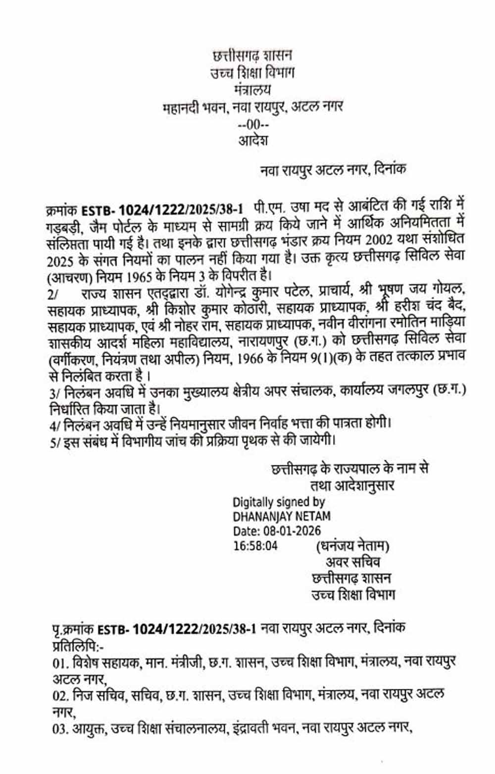 जारी आदेश के अनुसार सामग्री क्रय में गड़बड़ी, प्रक्रियागत अनियमितता एवं छत्तीसगढ़ वित्तीय नियम संहिता 2002 (संशोधित 2025) के उल्लंघन की पुष्टि प्रथम दृष्टया होने पर यह निर्णय लिया गया। इसके तहत महाविद्यालय के प्राचार्य डॉ.योगेंद्र पटेल,सहायक प्राध्यापक भूषण जय गोयल, किशोर कुमार कोठारी, हरीश चंद बैद एवं नोहर राम के नाम शामिल हैं। निलंबन आदेश के तहत सभी संबंधित अधिकारियों को छत्तीसगढ़ सिविल सेवा (वर्गीकरण, नियंत्रण तथा अपील) नियम 1966 के नियम 9(1)(क) के अंतर्गत तत्काल प्रभाव से निलंबित किया गया है। निलंबन अवधि के दौरान उनका मुख्यालय क्षेत्रीय अपर संचालक, कार्यालय जगदलपुर (छ.ग.) निर्धारित किया गया है तथा उन्हें नियमानुसार जीवन निर्वाह भत्ते की पात्रता होगी।