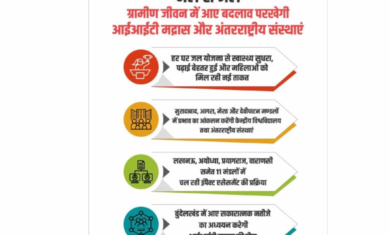 जल जीवन मिशन के तहत लागू ‘हर घर जल’ योजना से ग्रामीण इलाकों में नल से शुद्ध पेयजल पहुंचाकर रोजमर्रा की जिंदगी में बड़ा बदलाव लाया जा रहा है। अब इस बदलाव की वास्तविक तस्वीर सामने लाने के लिए प्रदेश के विभिन्न जिलों में केंद्रीय/राज्य विश्वविद्यालय, आईआईटी मद्रास तथा अंतरराष्ट्रीय संस्थाओं से प्रभाव आकलन (इंपैक्ट असेसमेंट) कराया जाएगा। लखनऊ, अयोध्या, प्रयागराज, वाराणसी समेत 11 मंडलों में इंपैक्ट असेसमेंट की प्रक्रिया फिलहाल चल रही है। बुंदेलखंड क्षेत्र में यह जिम्मेदारी आईआईटी मद्रास को दिए जाने की तैयारी है। मुरादाबाद, आगरा, मेरठ तथा देवीपाटन मण्डलों में प्रभाव का आंकलन केंद्रीय/राज्य विश्वविद्यालयों तथा अंतरराष्ट्रीय संस्थाओं से कराने की योजना है।