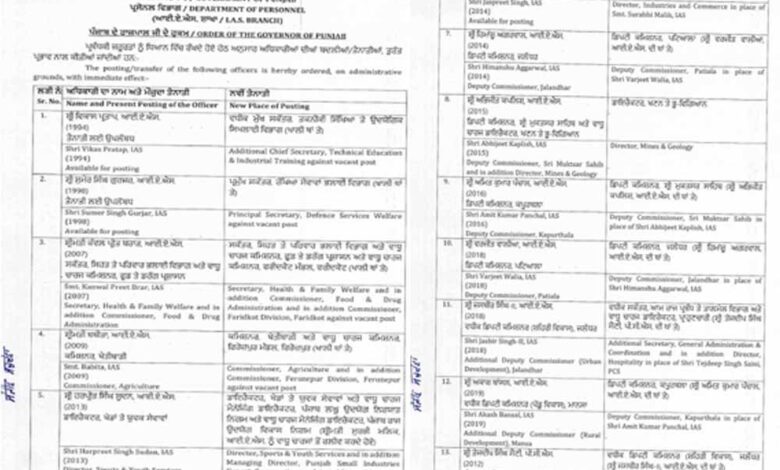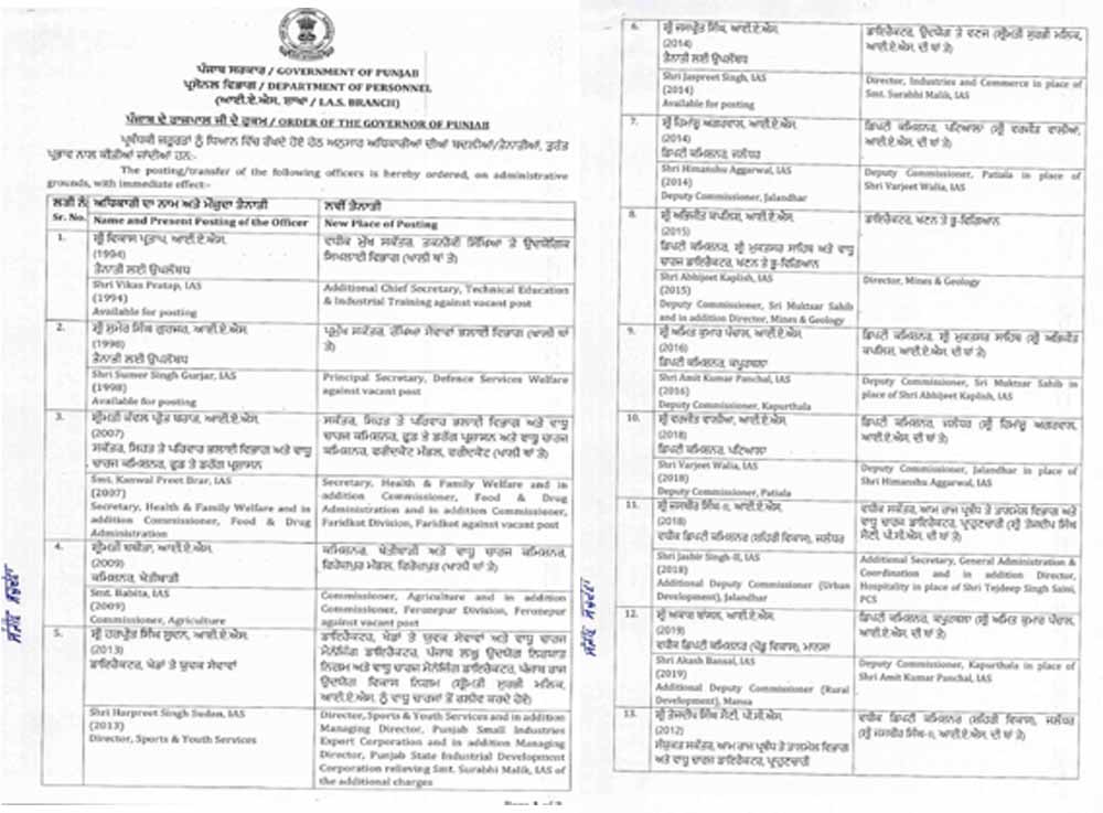 पंजाब में आज बड़ा प्रशासनिक फेरबदल हुआ है। इस दौरान कुल 12 IAS व एक PCS अधिकारियों का तबादला किया गया है। बता दें कि जारी आदेशों में जालंधर सहित कई जिलों के DC बदले गए हैं। हिमांशु अग्रवाल को पटियाला का डिप्टी कमिश्नर बनाया गया है जबकि विरजीत वालिया को जालंधर का डिप्टी कमिश्नर बनाया गया है।